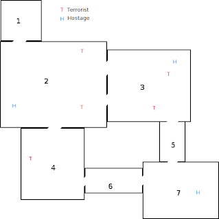 This is a diagram of a fairly simple building, it contains a starting room (1), a large room (2) with a hostage and two terrorists: three doors connecting to two other rooms (3 and 4), containing terrorists and a hostage. Those rooms (3 and 4) connect to a final room (7) by way of hallways (5 and 6, respectively), and contains a hostage.