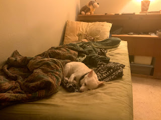 December 2, 2019 by Terry Poulin Smart doggos: Willow’s comfy in the foreground, Corky has claimed my pillow, and I’m not even sure if Misty’s snoot sticking out from the blankets in the middle can be seen in the photo, lol.