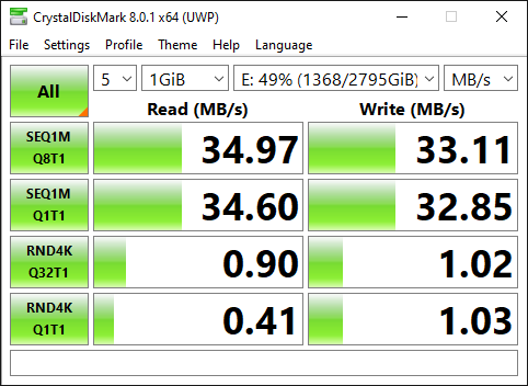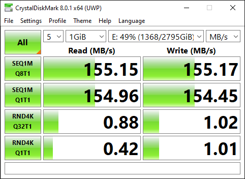Damningly, if I connect an old Samsung SSD through the enclosure: I get about the same level of performance. While nearly old as the drive the enclosure is a 3.0 with UASP that has generally delivered hard drive performance just fine until recently.