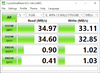 I think that my spare enclosure made its way to work for various need fillings. So the other of the three is hanging off my Xbox with a 1 TB drive that is probably manufactured circa 2012. Perhaps I will swap that 1 TB drive with this 3 TB drive and use that for a comparison; can break that down into power supply, USB cable, and enclosure without having to pull the PCB. More detailed testing will require hooking it up to my Linux machines.