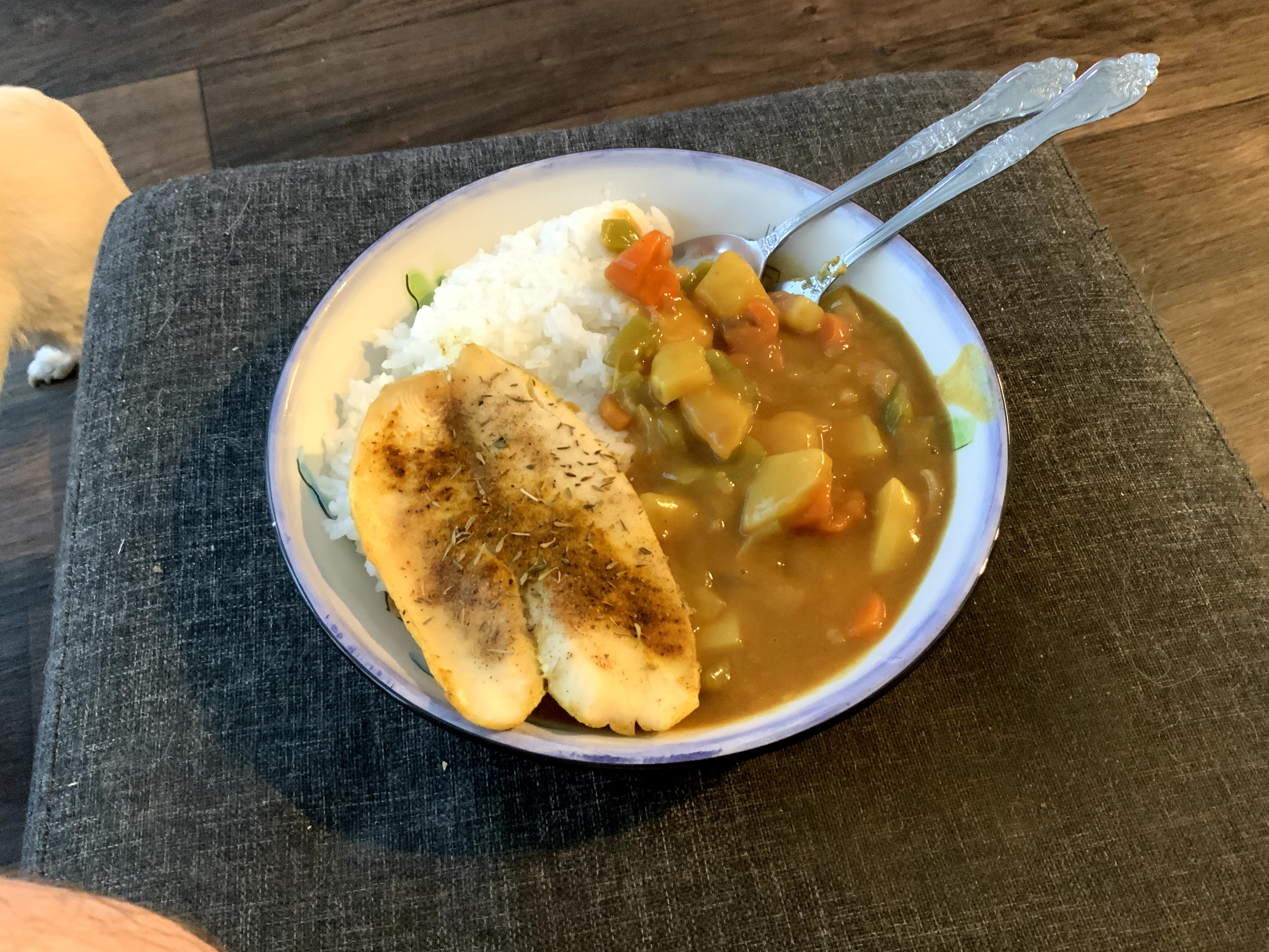 Made a trip to Sprouts Farmer’s market this morning to pick up some vegetables, and I owe that decision for how delicious this turned out. The fresh potatoes, carrots, onion, and bell pepper made the best curry I’ve had in a long time. Made the fish similar to my usual method; kept the garlic powder, salt, and black pepper; used a light spritz of curry powder and some thyme rather than adding soy sauce to the braising water. Ended up making the tilapia a bit dry compared to normal, which in retrospect was perfect for going with the curry rice.