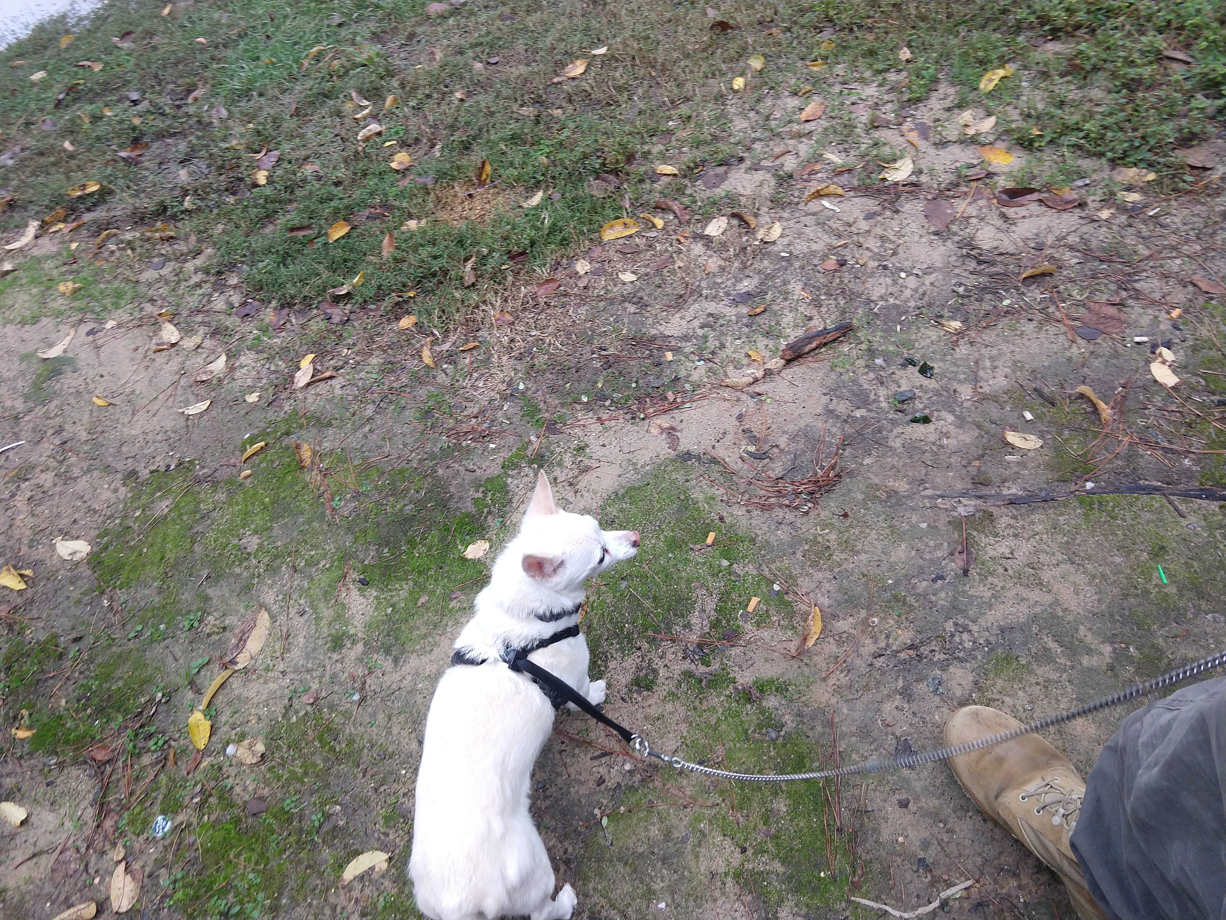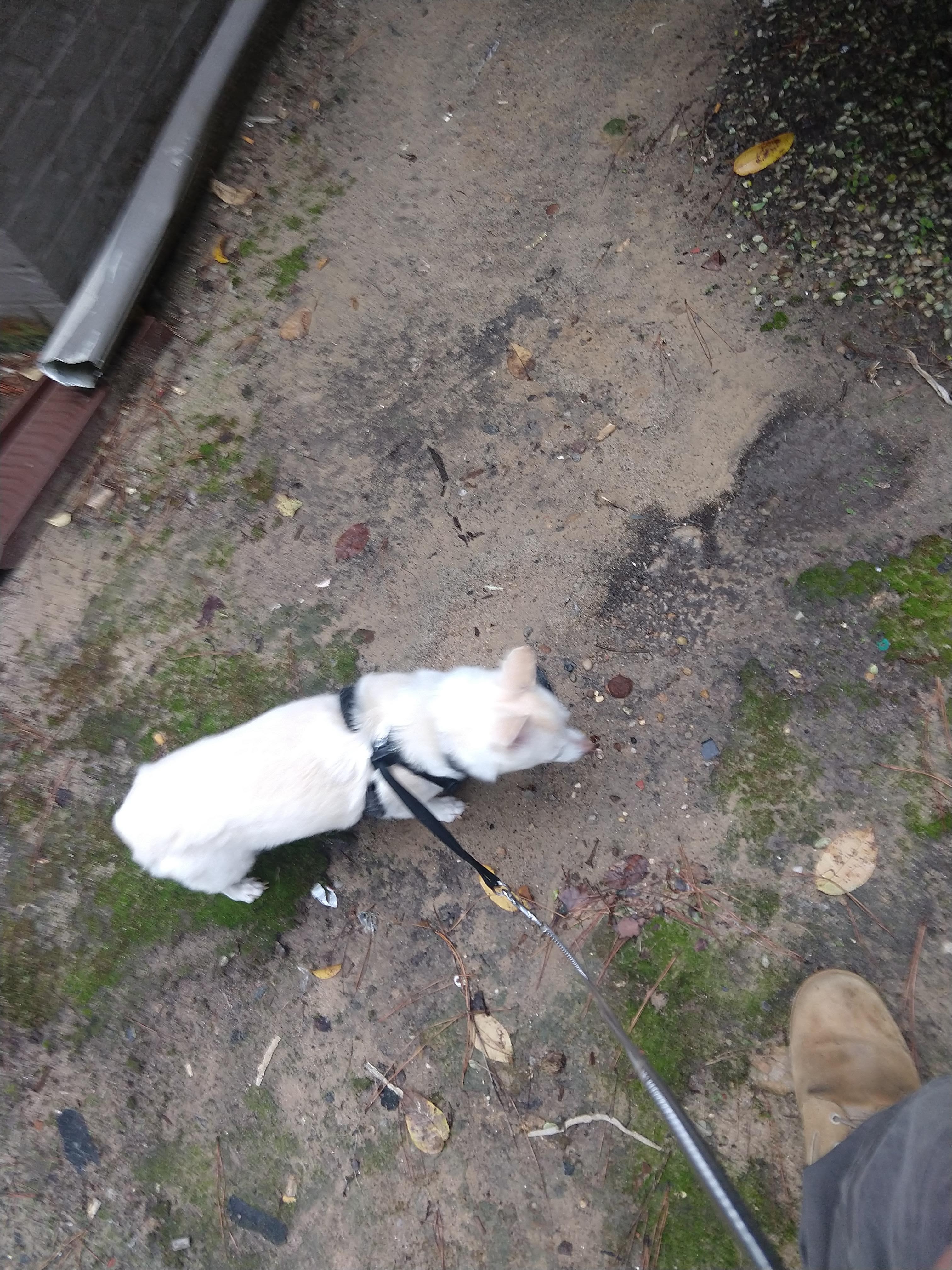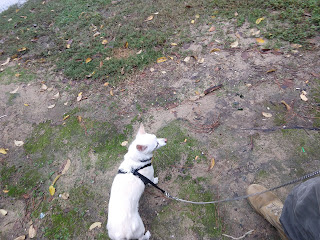 We went for a morning walk, it was nice. I got to sniff many plants, and pee on a few of them.