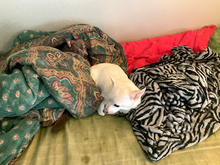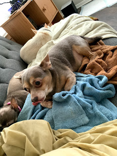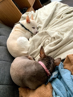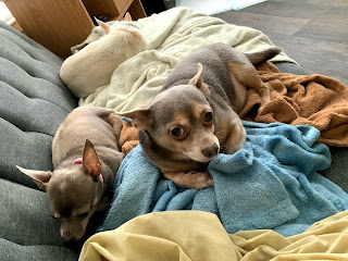 Had shifted to the couch because Willow as getting antsy, and I kind of agree with her about me spending too much time at my desk in the lair. Ended up with three comfy dogs, with Corky sitting on my arm and slobbering it while the other two napped along side.