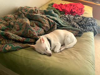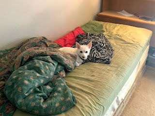 Work called, so I needed to sort a few things remotely, after extricating my arm for dog slobber. Ended up with one dog next to my foot, and two over on the bed. Willow being sprawled out and comfy while I resolved the work matter.