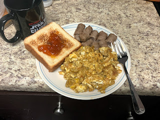 Another win is that one slice of Texas toast is enough for breakfast. Usually I would make two slices of toast is on the menu. Combined with trying to use up some old eggs, and sausages to share, let’s just say that Willow and company only care about their share, lol.
