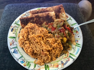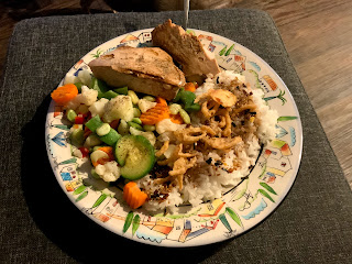 Probably a 1/3 can of garbanzo beans (69¢), a bag of frozen peppers/onions ($1~$1.29) that had a seasoned date with a skillet, rice with furikake and soy sauce, and a baked yellowfin tuna fillet (usually $6.99 for 3 frozen fillets). I think the fish was on “Please, someone just buy it” or near BOGO level sale pricing last time I bought fish.