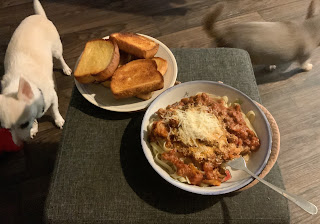 But I am still forgiven for enforcing the pecking order, that their main treats come after dinner. Which tonight amounted to a helping of canned meat/gravy yumnums, and then a regularly scheduled dog treat, lol.