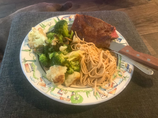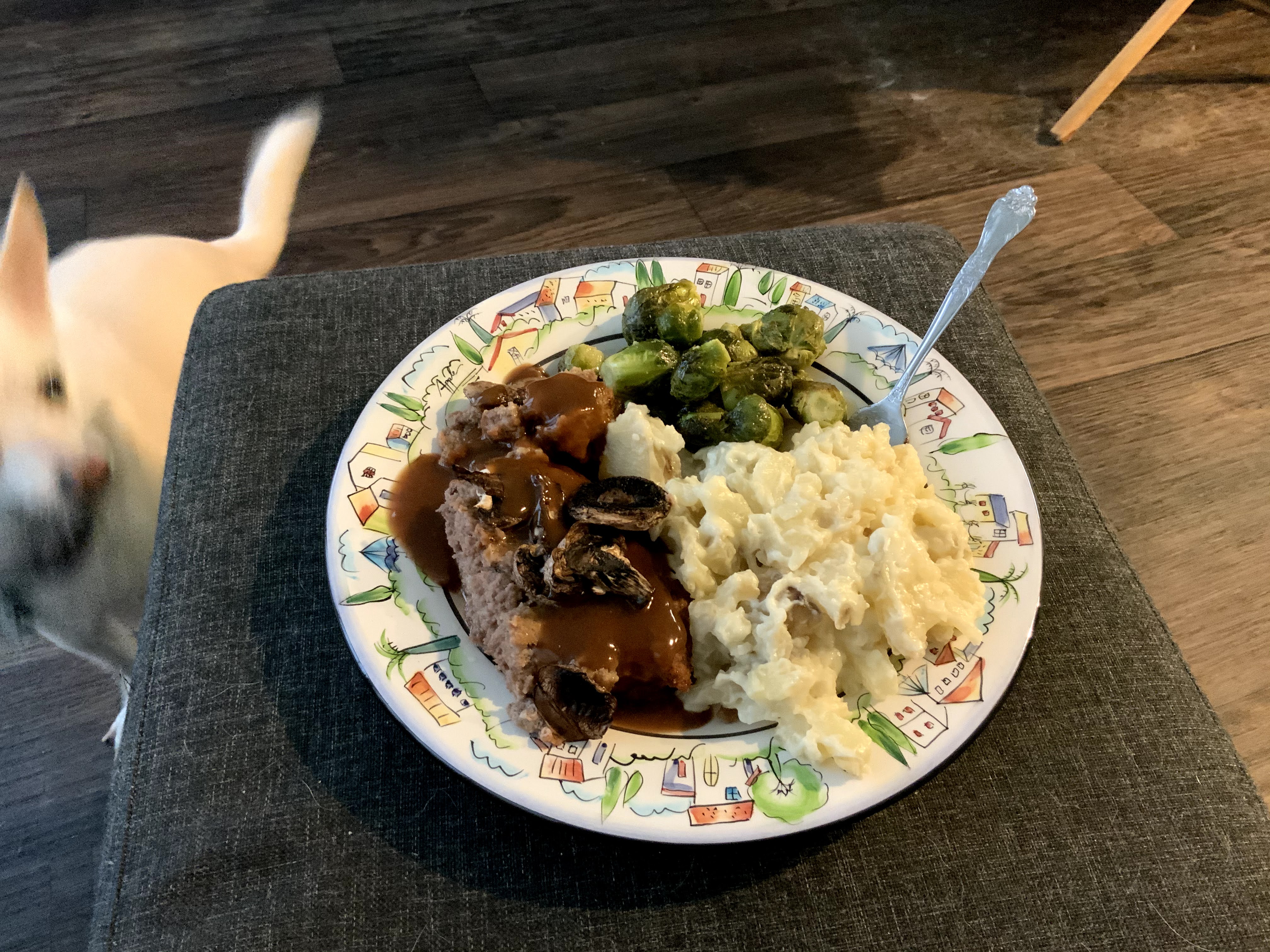 Because I’m weird: the side is roasted brussle sprouts. My mother would usually make green beans out of a can, or in later years some mixture of green, white, and red vegetables cooked until soft, mushy, and seasoned Italian style. The latter was always far better than the former, and probably played a large part in why veggies are a focus of many meals around here. You can bet my habits of roasting sprouts and carrots share seasoning characteristics with my mother’s cooking, lol.