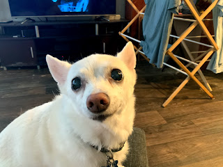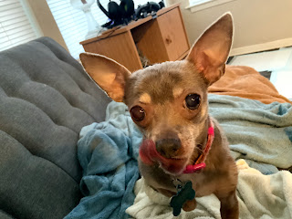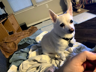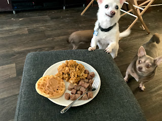 The five frozen sausage are quartered, and meant to be shared with the hounds. Roughly a 2 for them, 3 for me kind of arrangement. The toasted waffle (often, toasted bread) for belly filler. And 3 eggs scrambled for yum. In this case with soy sauce, salt, brown sugar, and some cheddar mixed in.