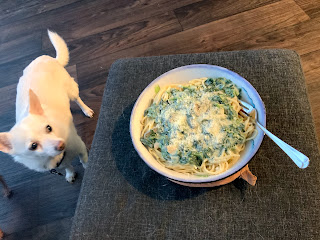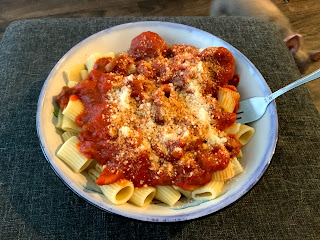One of the better aspects of having gone grocery shopping a weeek or two before people lost their minds to covid19: being well stocked on pasta, and related yummies.